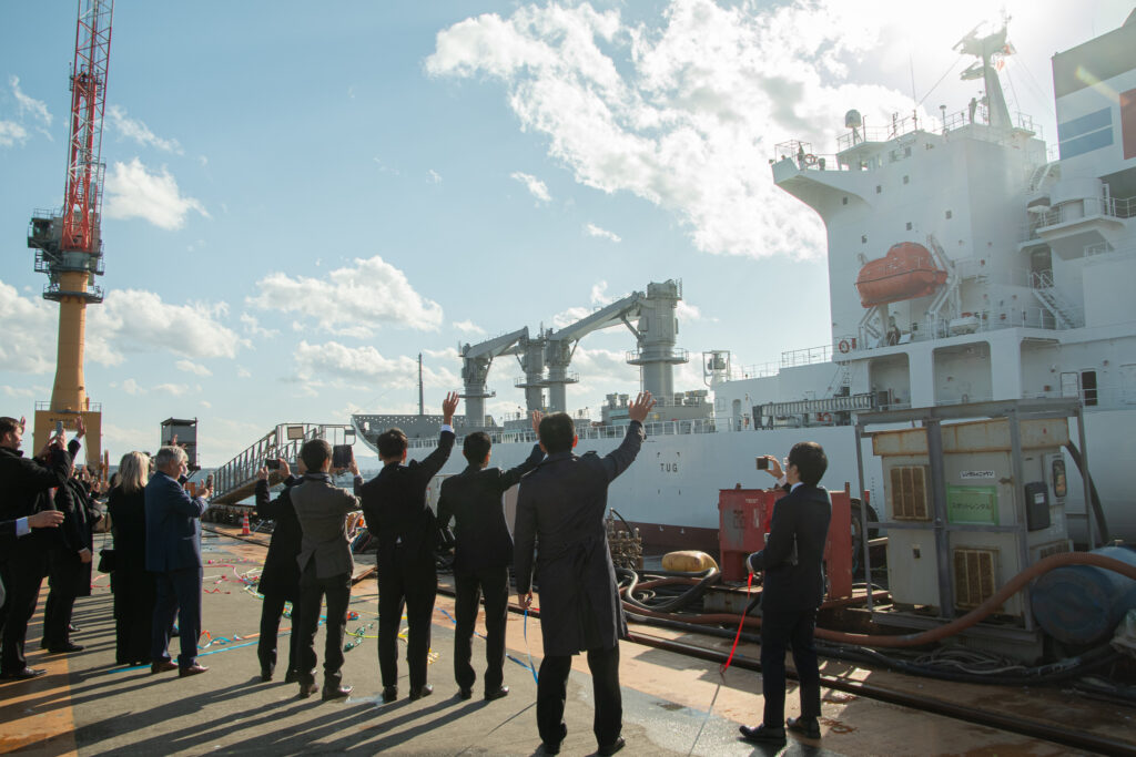 2025年11月21日、当社建造ナンバー第725番船・60万立法フィート型大型冷凍運搬船の命名引渡式を、弊社豊洲工場南桟橋にて執り行いました。式典時は朝からの雨も上がり、初冬のさわやかな空気に包まれ、本船引渡しを祝う事ができました。