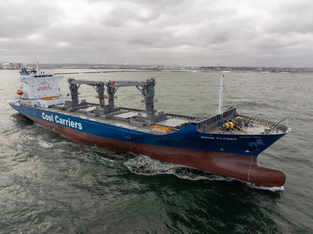 「SNOW FLOWER」は、63万立法フィート型冷凍運搬船プロジェクトの第4番船となります。貨物層内は酸素濃度を管理できるCA(Controlled Atmosphere)貯蔵システムを導入し、排気ガス浄化装置(SOxスクラバー)を搭載した環境対応、および窒素酸化物排出3次規制をクリアした最新鋭船になります。デッキ上には154本の40フィート型冷凍コンテナを積載可能で、更に40トン、8トン油圧シリンダークレーンを計4基装備し、港湾設備が不十分な港でも効率的な荷役を可能にします。傭船者は今回初めてとなるキプロスの船社となります。